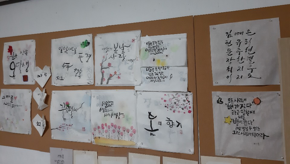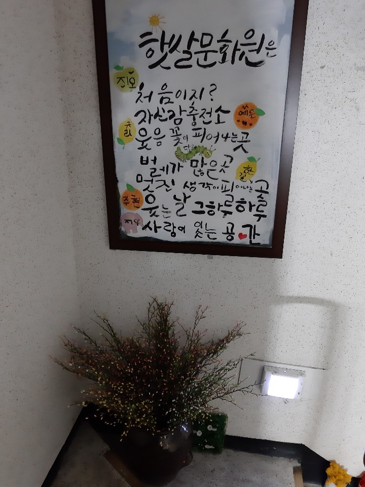 아이들이 예쁜 캘리그라피 솜씨로 적어 논 햇살문화원 소개가 보인다.
