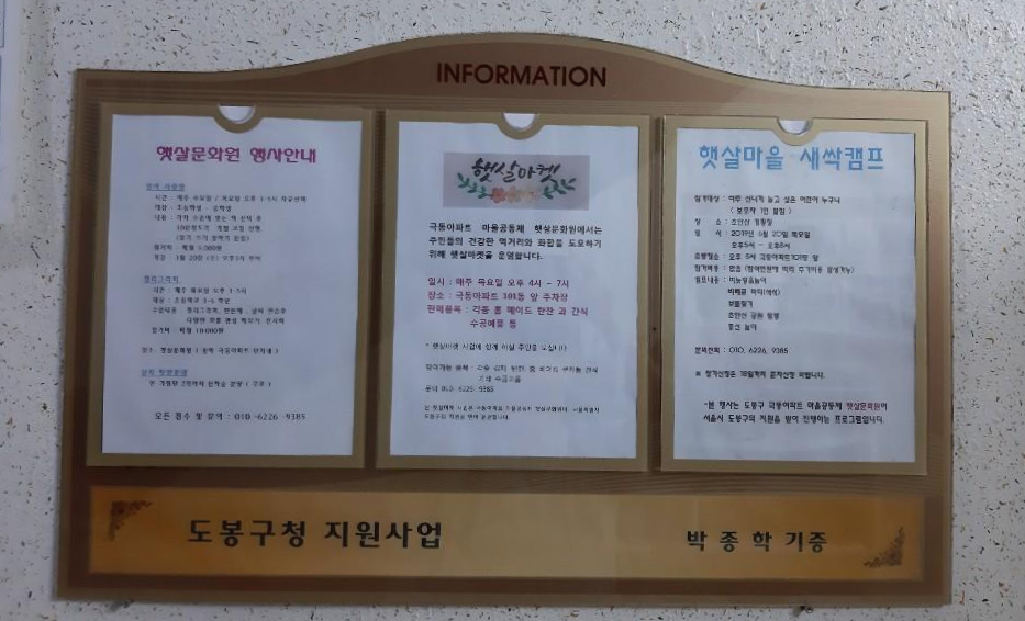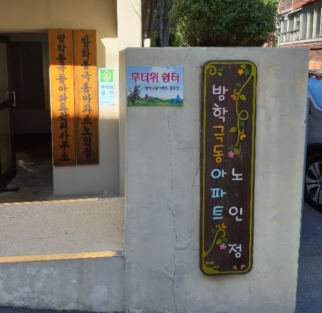 아파트 입구에 들어서니 알록달록 노인정 팻말이 눈에 띈다.