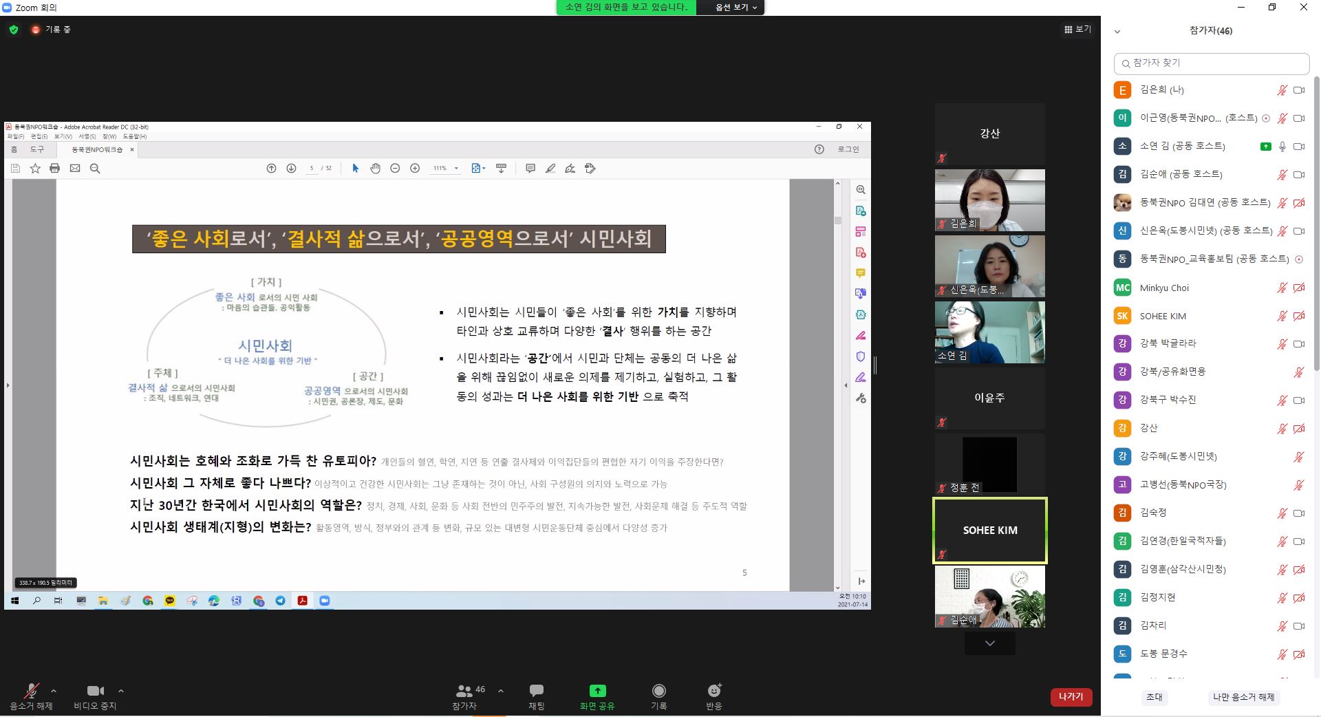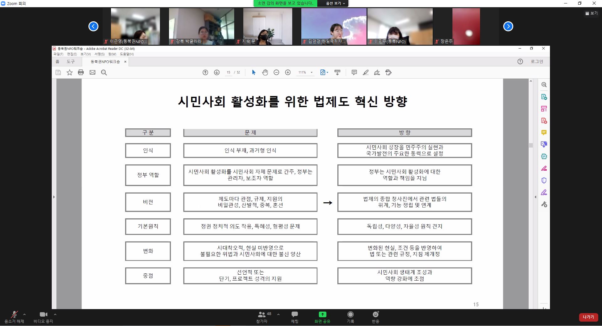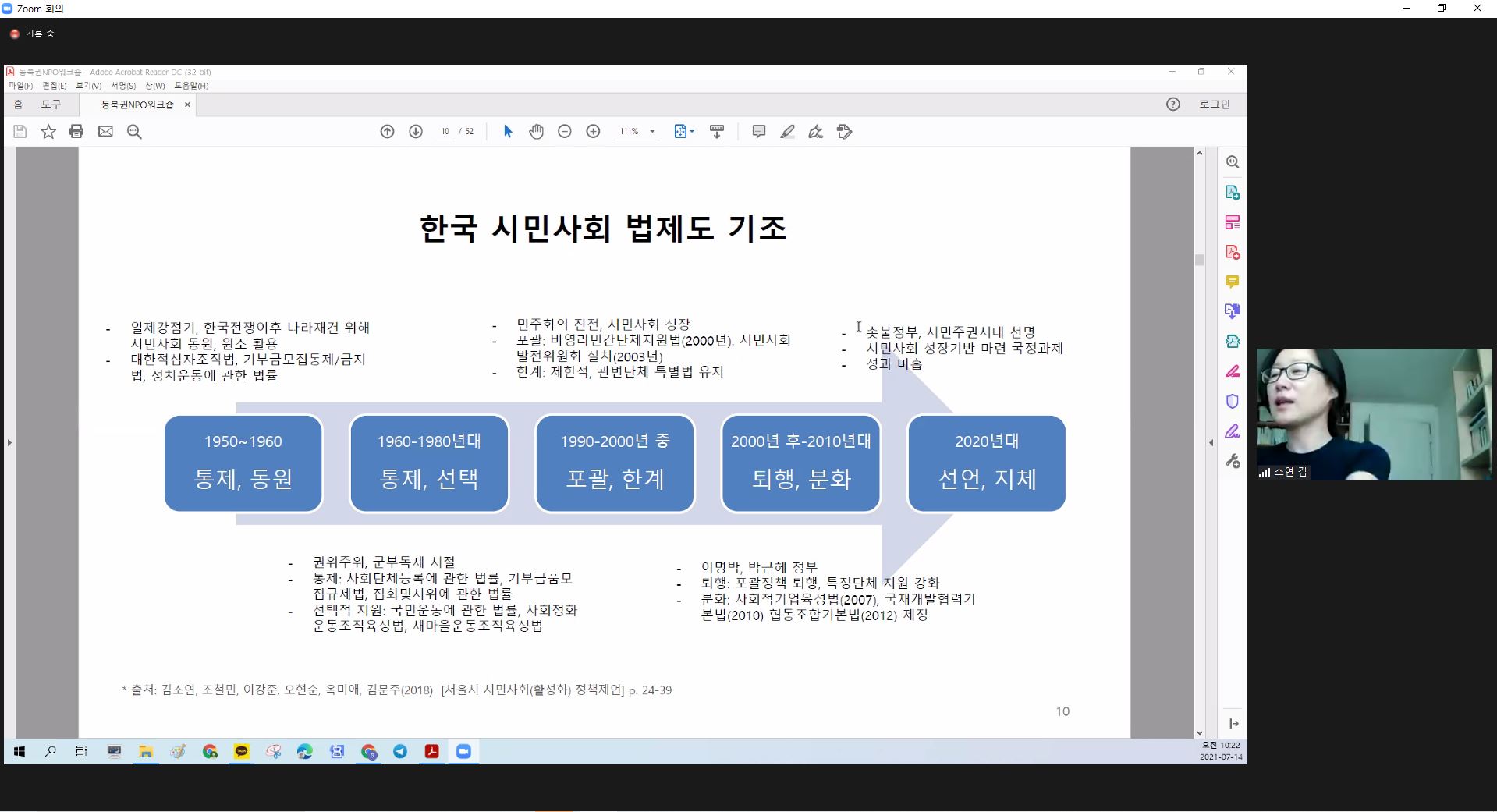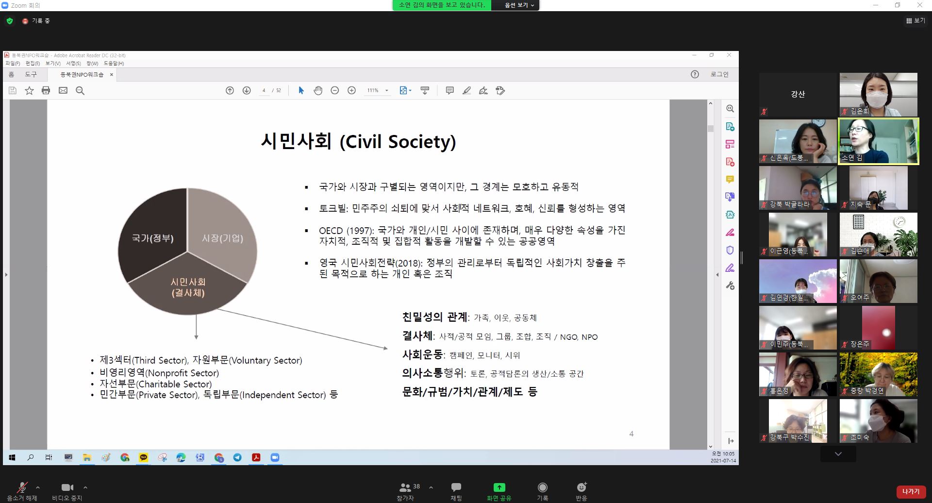 지난주 7월 14일 수요일 오전 동북 5구 시민사회 활동가들이 비록 비대면이었지만 모처럼 한자리에 모였습니다. 요즘 많이 이야기되고 있는 시민사회 3법에 대한 강연을 듣기 위해서입니다. 강연은 서울시 시민사회 활성화 기본조례와 기본계획 수립을 연구한 ‘시민사회 현장연구자모임, 들파’ 김소연 대표님이 진행하였습니다.