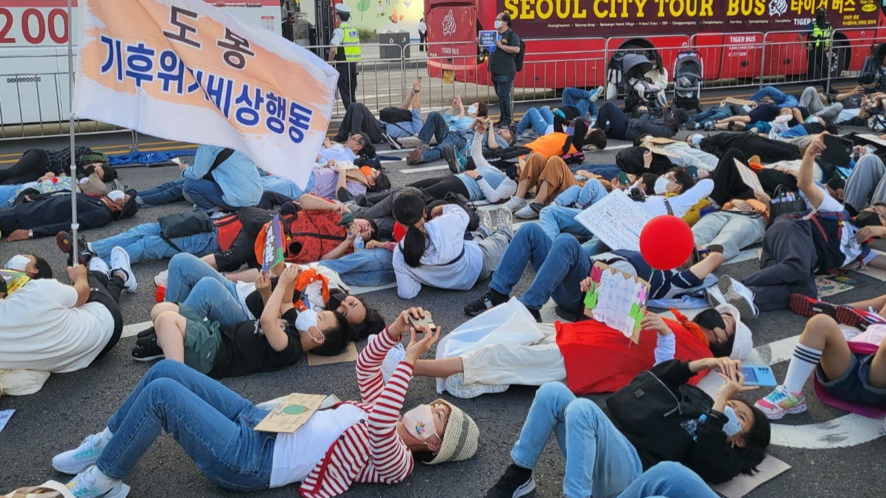 오후 4시부터는 시청역에서 시작하여 광화문, 종각역, 을지로입구역을 행진하였습니다. 10대의 선두 차량과 다양한 복장을 입은 참여자들의 퍼포먼스, 조형물이 있었고, 행진 대열 중간마다 타악대, 풍물패 등의 가두 공연팀이 공연도 하였습니다. 특히 광화문 광장에서 다이인 퍼포먼스는 모두의 가슴을 뭉클하게 만드는 시간이었습니다. '죽은 듯이 눕는다'는 뜻을 가진 다이-인 Die-In은 참가자들이 5분여 동안 땅에 누워 진행하는 평화적이고 비폭력적인 시위로, 지금도 일어나고 있는 기후 재난에 항의하고 앞으로 다가올 우려스러운 미래를 상징하는 퍼포먼스입니다. 누워서 바라본 하늘은 그날따라 너무도 푸르고 눈부셨습니다. 개인적으로 오늘처럼 이렇게 푸르른 하늘을 다음 세대에게도 꼭 보여주고 싶다는 다짐의 시간이었습니다.