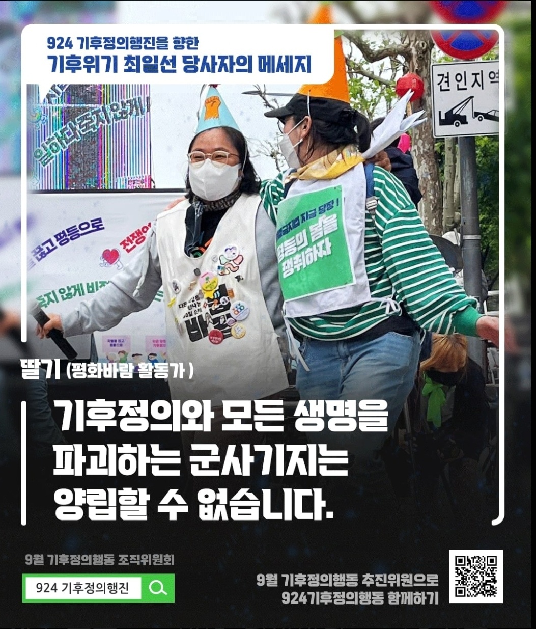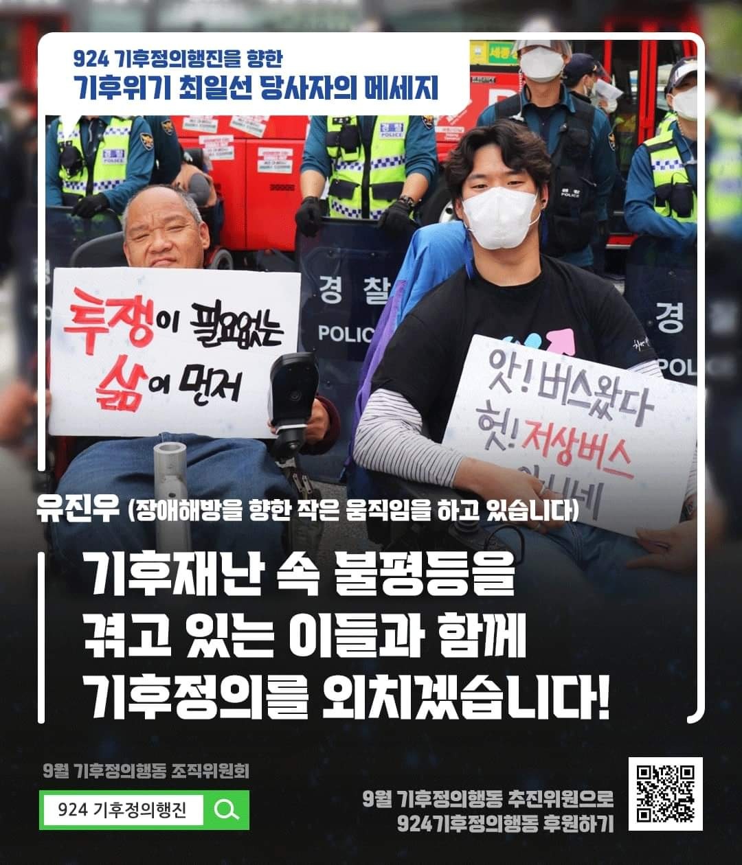 지난 9월 24일 토요일, 시청 근처에서 9/24 기후정의행진이 진행되었습니다. 기후정의행진은 "우리는 모두 생명에 대한 권리를 가지고 있으며, 자유롭고 안전하게 살아갈 권리가 있다"는 세계인권선언 제3조를 바탕으로 파괴적 이윤추구와 자본주의의 성장체제가 기후재난의 원인임을 명확히 하고, 적극적은 역할을 요구하기 위한 행진 및 집회입니다. 이날 집회를 위해 8월 말부터 전국 각 지역에서 9월 기후정의행동 조직위원회와 추진위원 모집이 진행되고, 다양한 홍보 활동과 사전 행동들이 진행되었습니다.