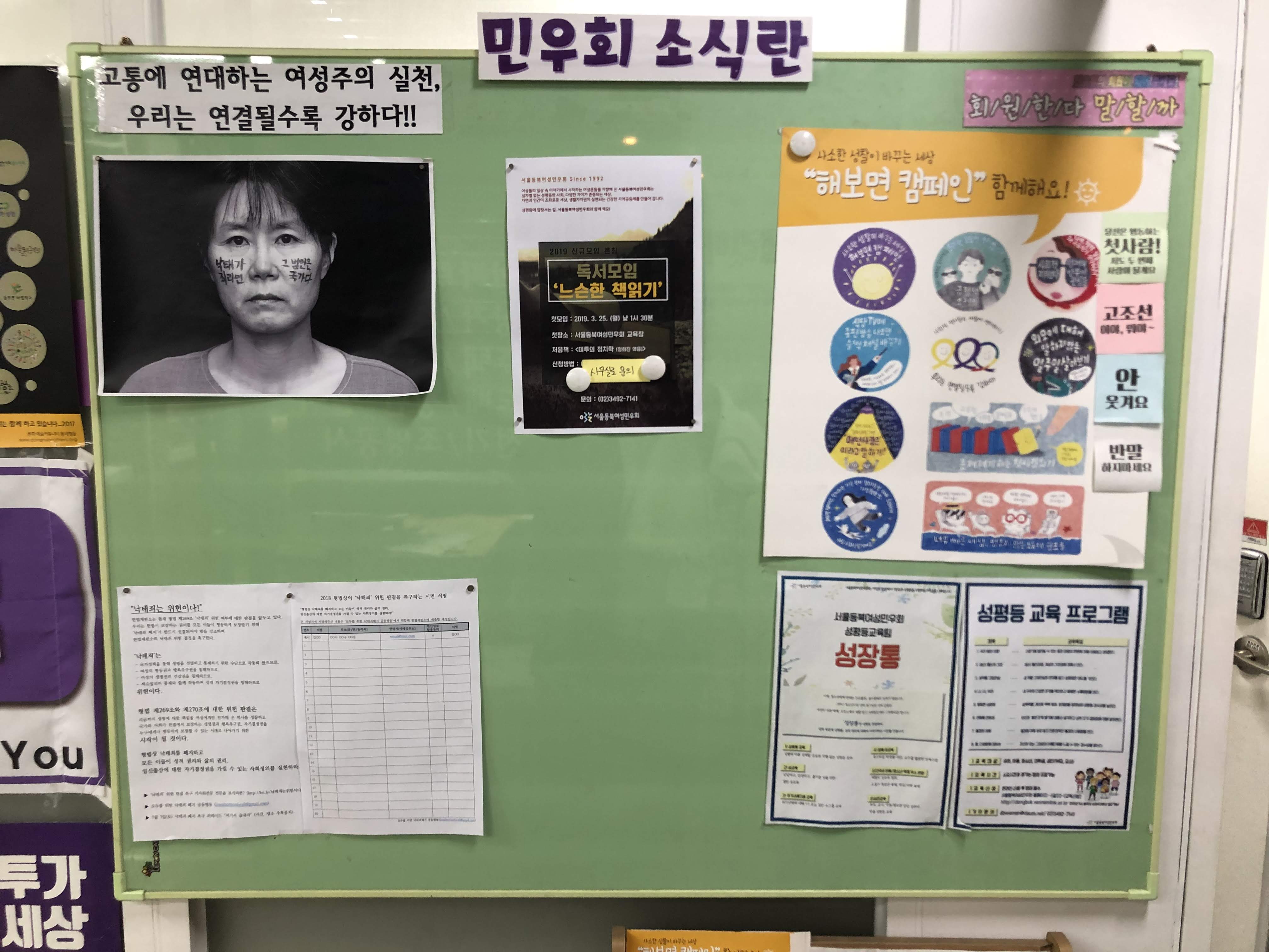 활동가로서의 정체성을 장착한지는 그리 길지 않다. 나는 위빠사나 명상수행을 하는 수행자이기도 한데, 수행자의 정체성을 가장 크게 가졌던 시기동안, 민우회바깥에서 민우회를 바라볼 시간이 있었다. 결국 그 시기에도 마을에서 다양한 작당모의를 하며, 결국 강북여성주의모임 문을 만나 신나는 한해를 보냈지만.